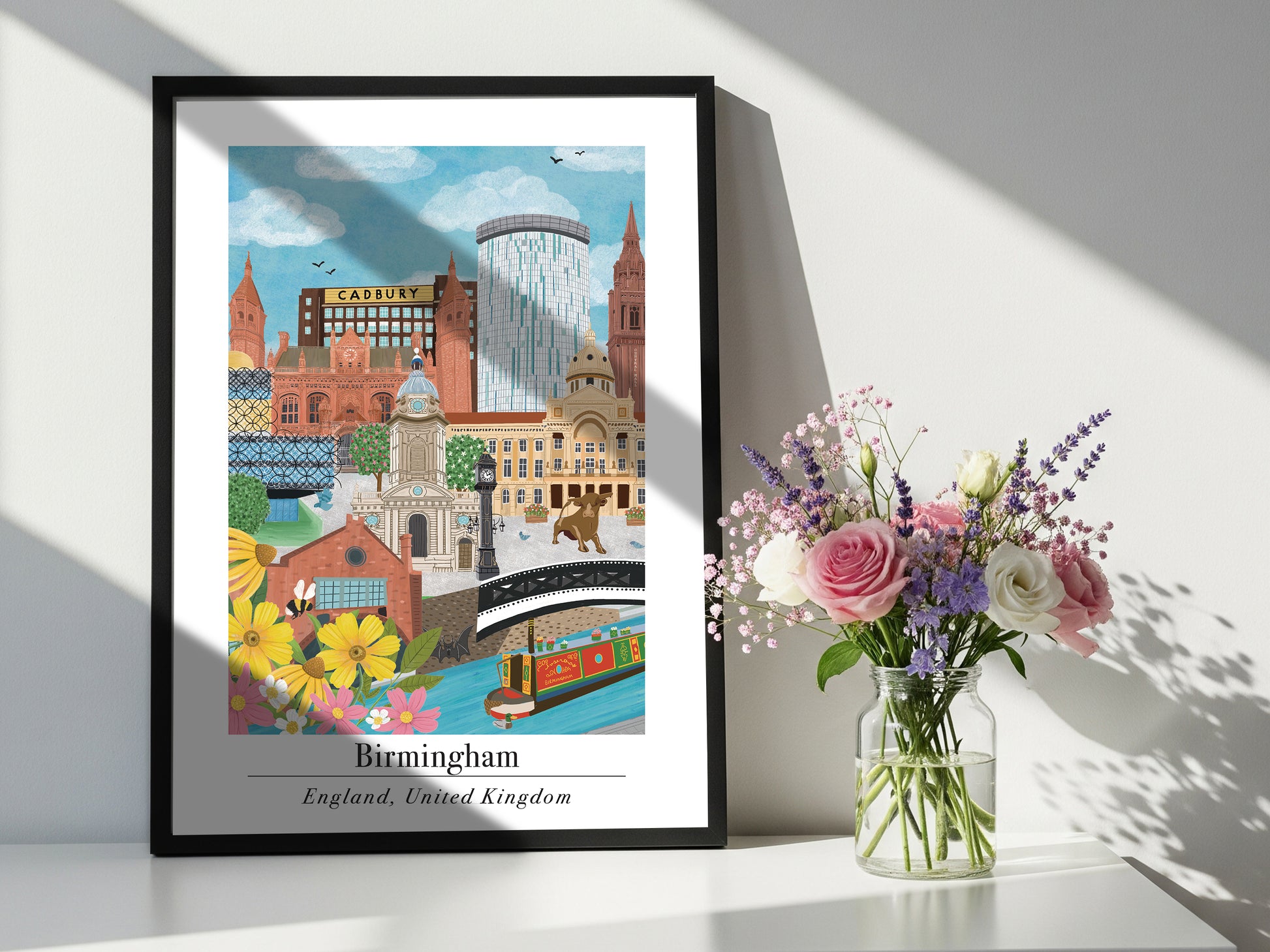 Celebrate the City of Birmingham with this beautifully detailed illustrated art print. Inspired by local landmarks, architecture, and natural elements, this vibrant design captures the spirit and charm of Birmingham in a unique and decorative style.